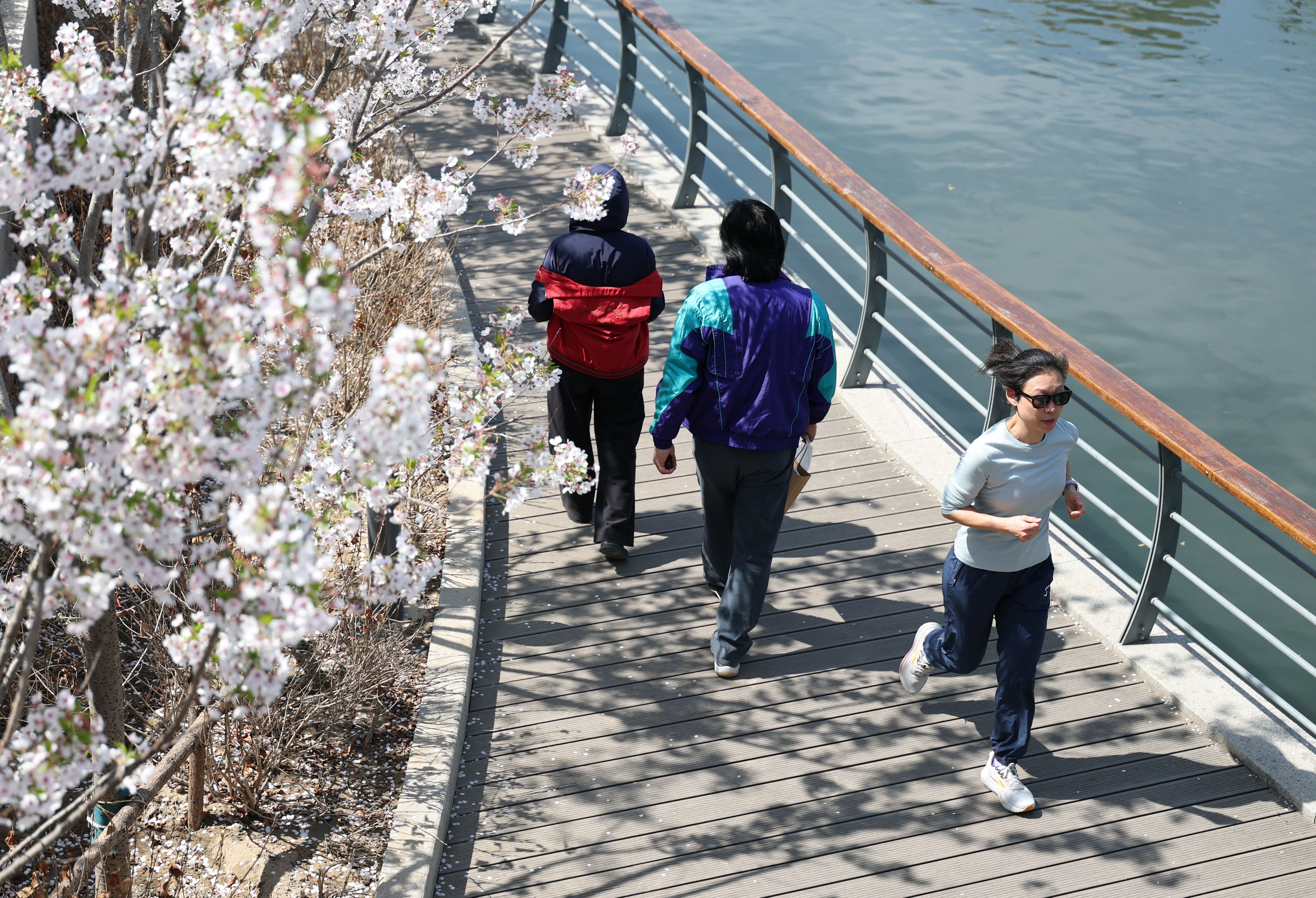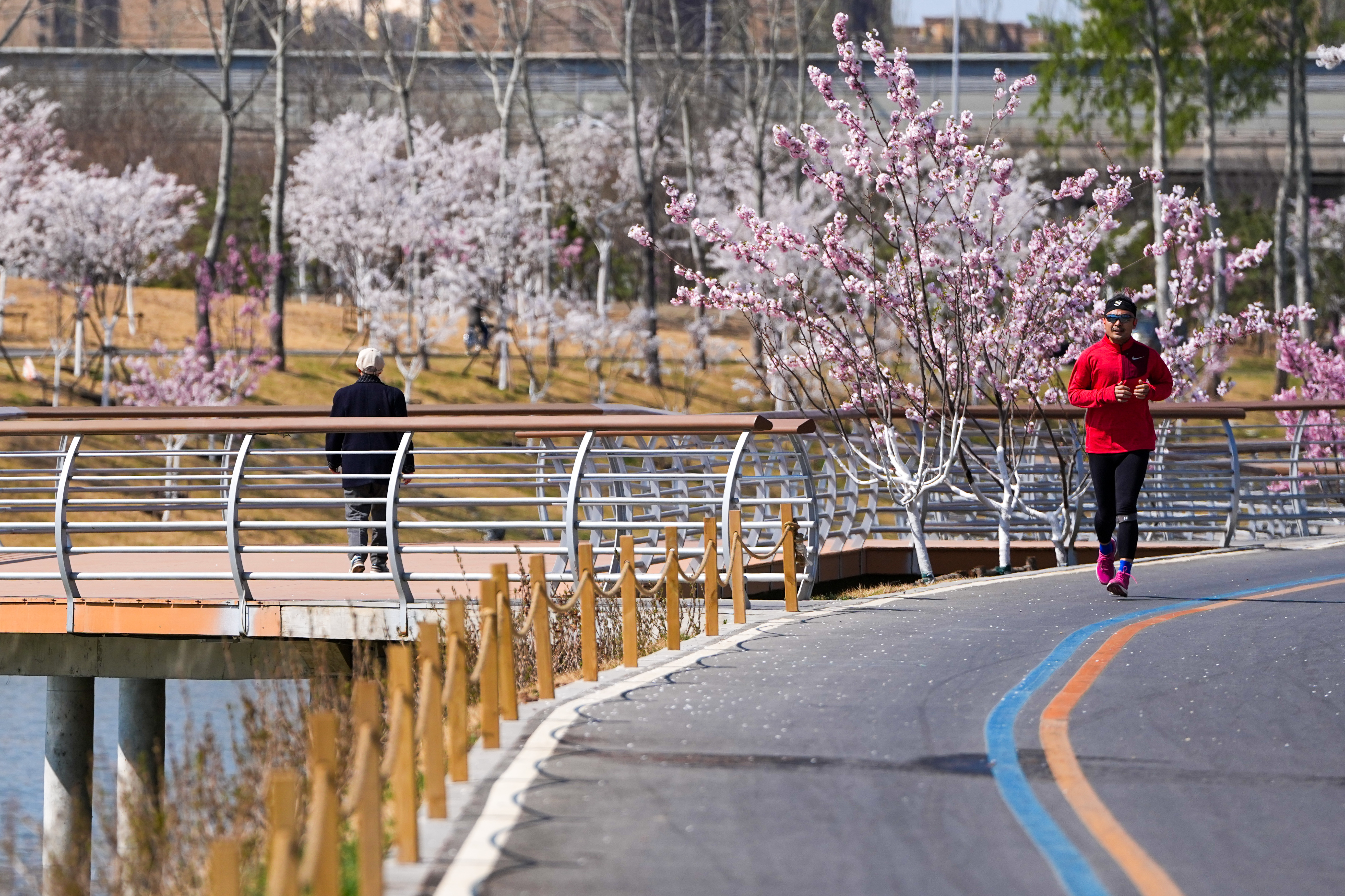 市民在鲜花盛开的北京市坝河岸边跑步锻炼(4月1日摄)。 新华社记者 鞠焕宗 摄