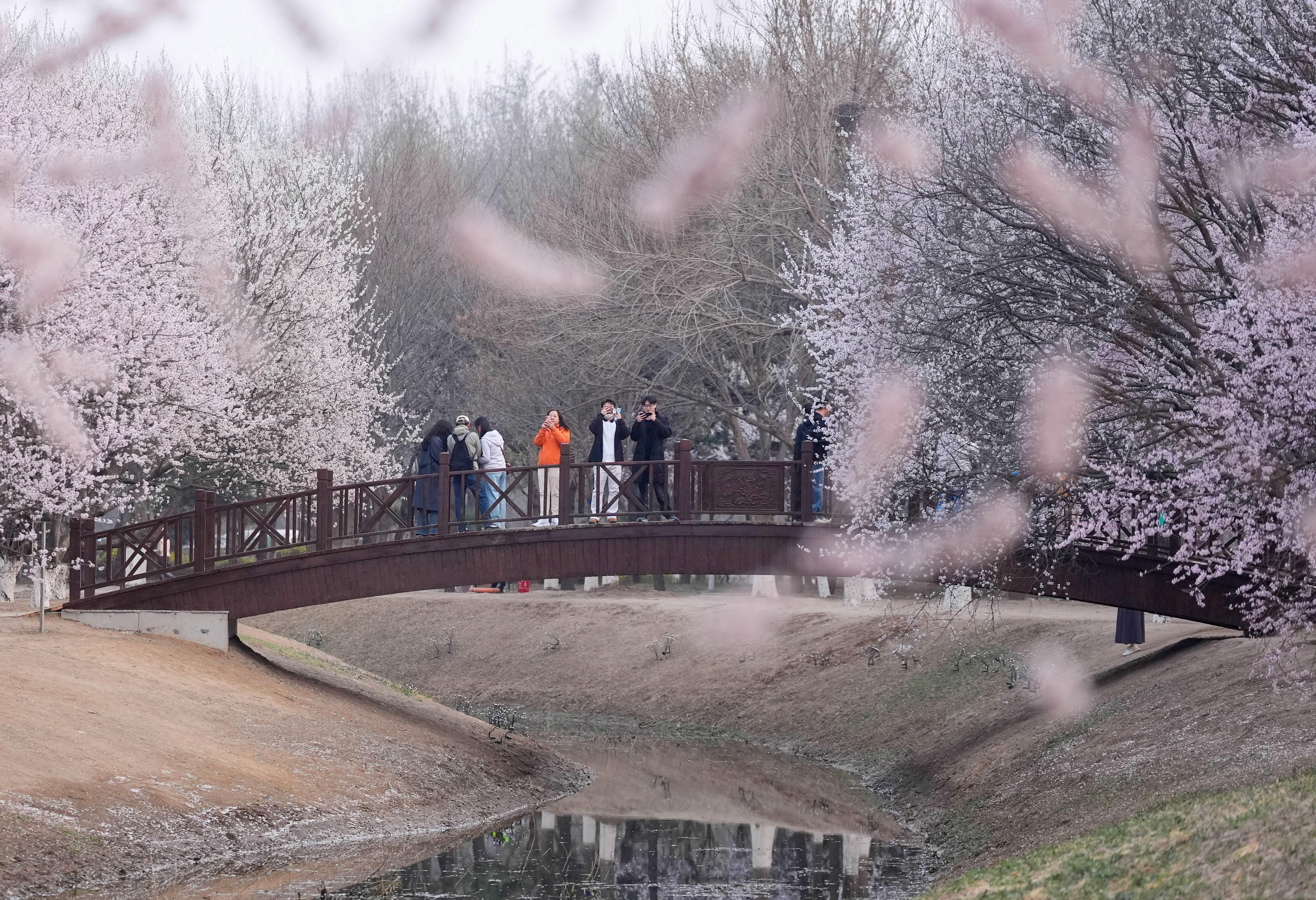 市民在北京市坝河岸边赏花拍照(4月1日摄)。 新华社记者 鞠焕宗 摄