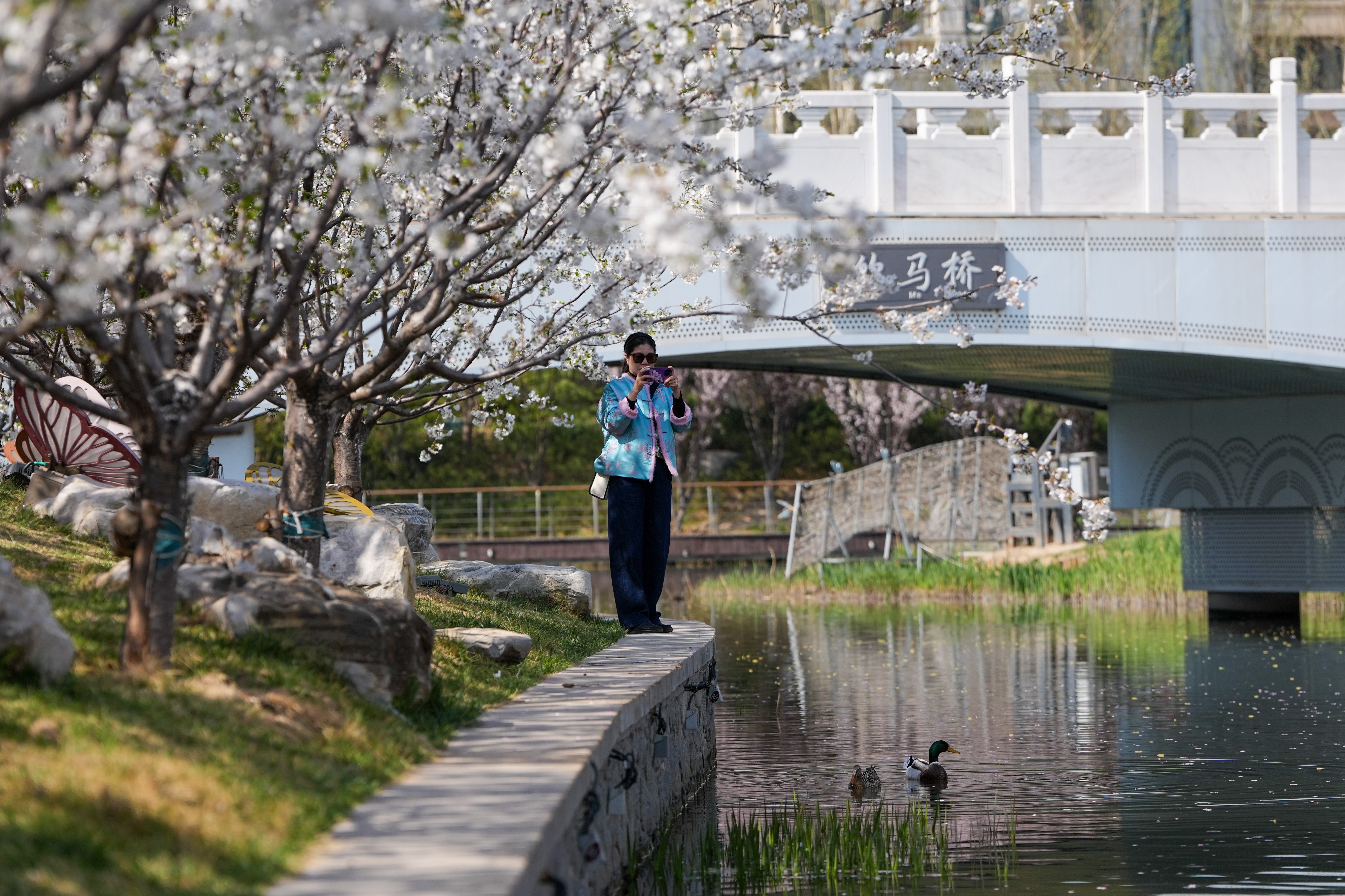 在北京朝阳区亮马河国际风情水岸,游客在樱花盛开的河边赏花拍照(4月1日摄)。 新华社记者 鞠焕宗 摄