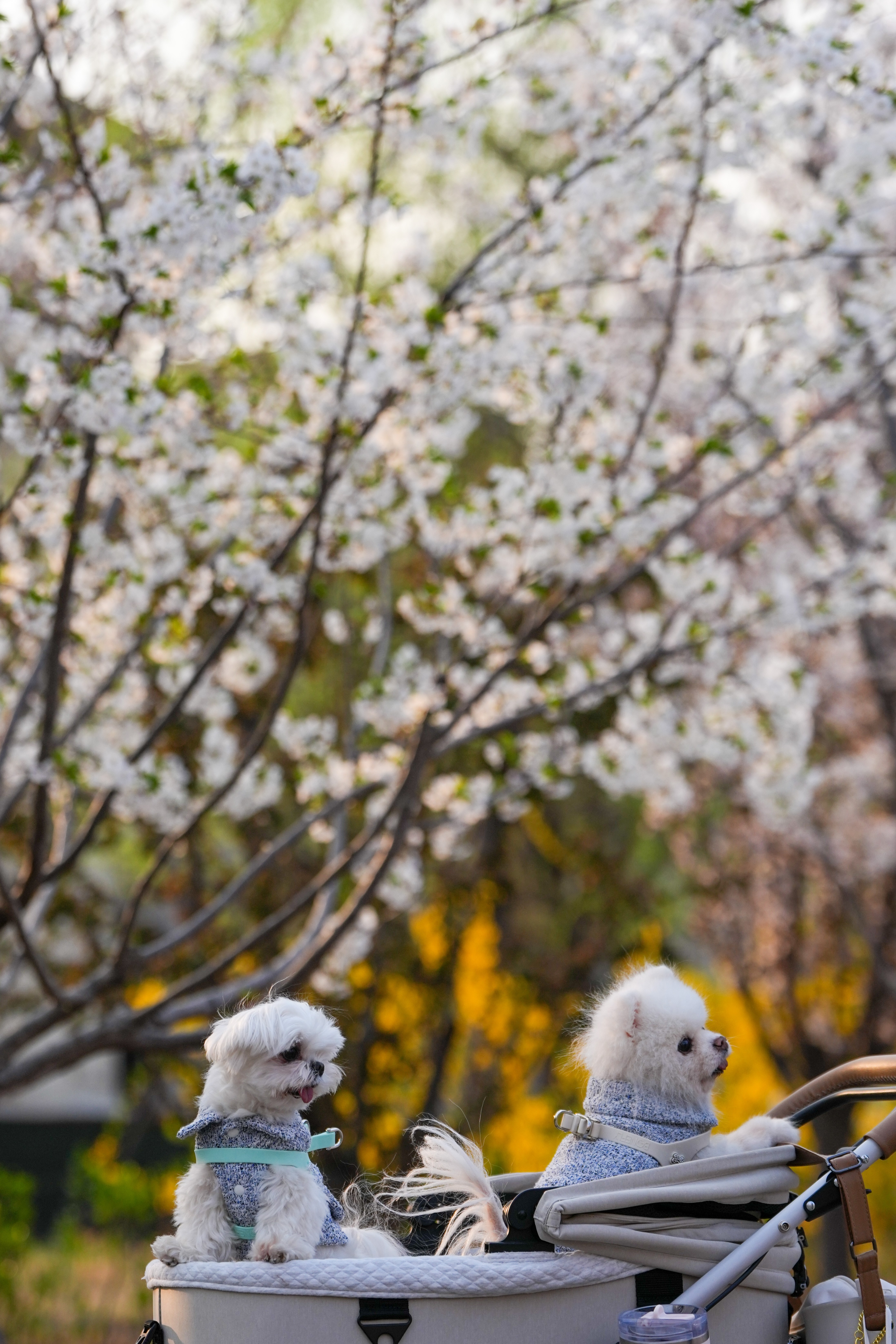 在北京朝阳区亮马河国际风情水岸拍摄的樱花树下的两只小狗(4月1日摄)。 新华社记者 鞠焕宗 摄