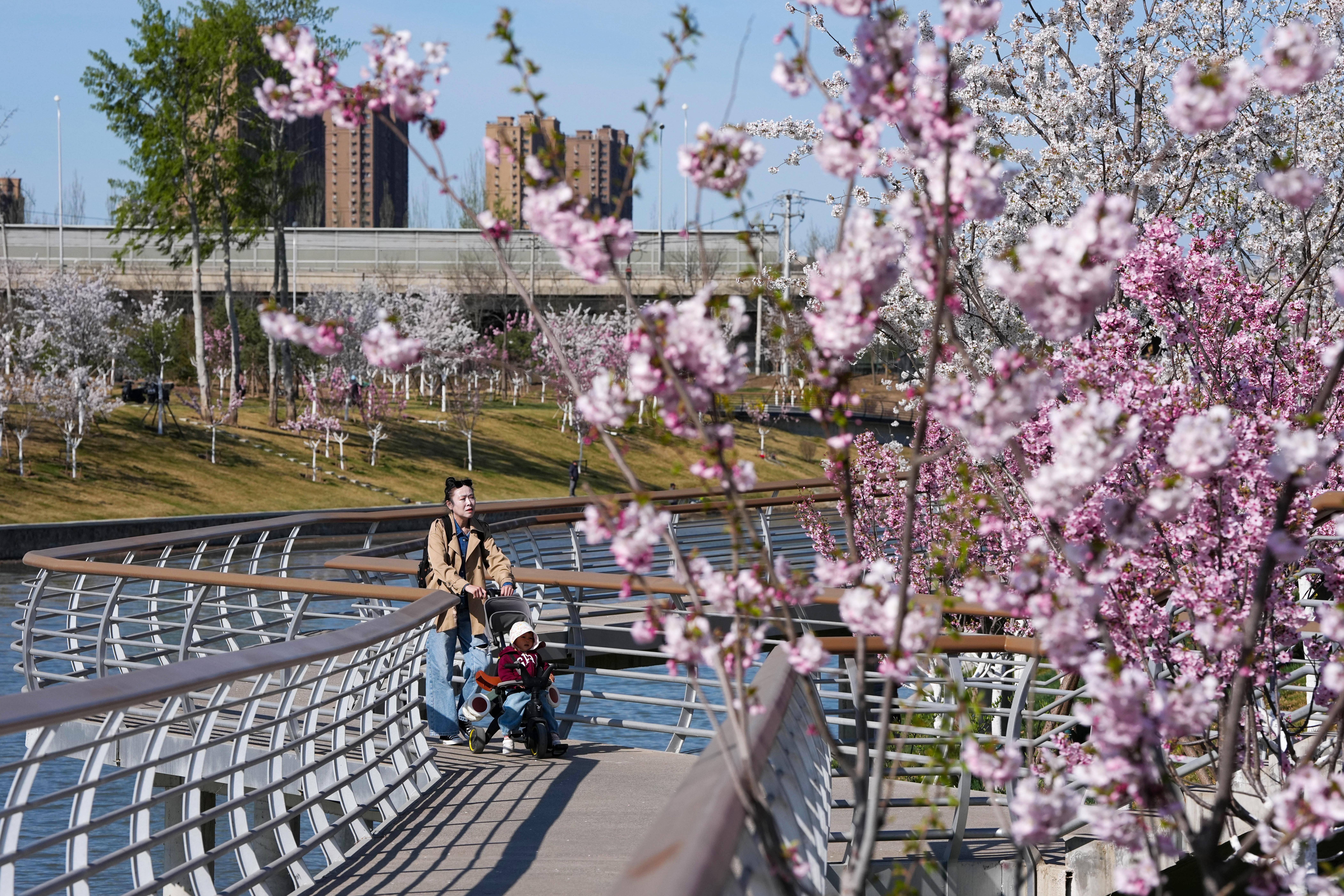 在北京市坝河岸边,行人推着小朋友赏花游玩(4月1日摄)。 新华社记者 鞠焕宗 摄