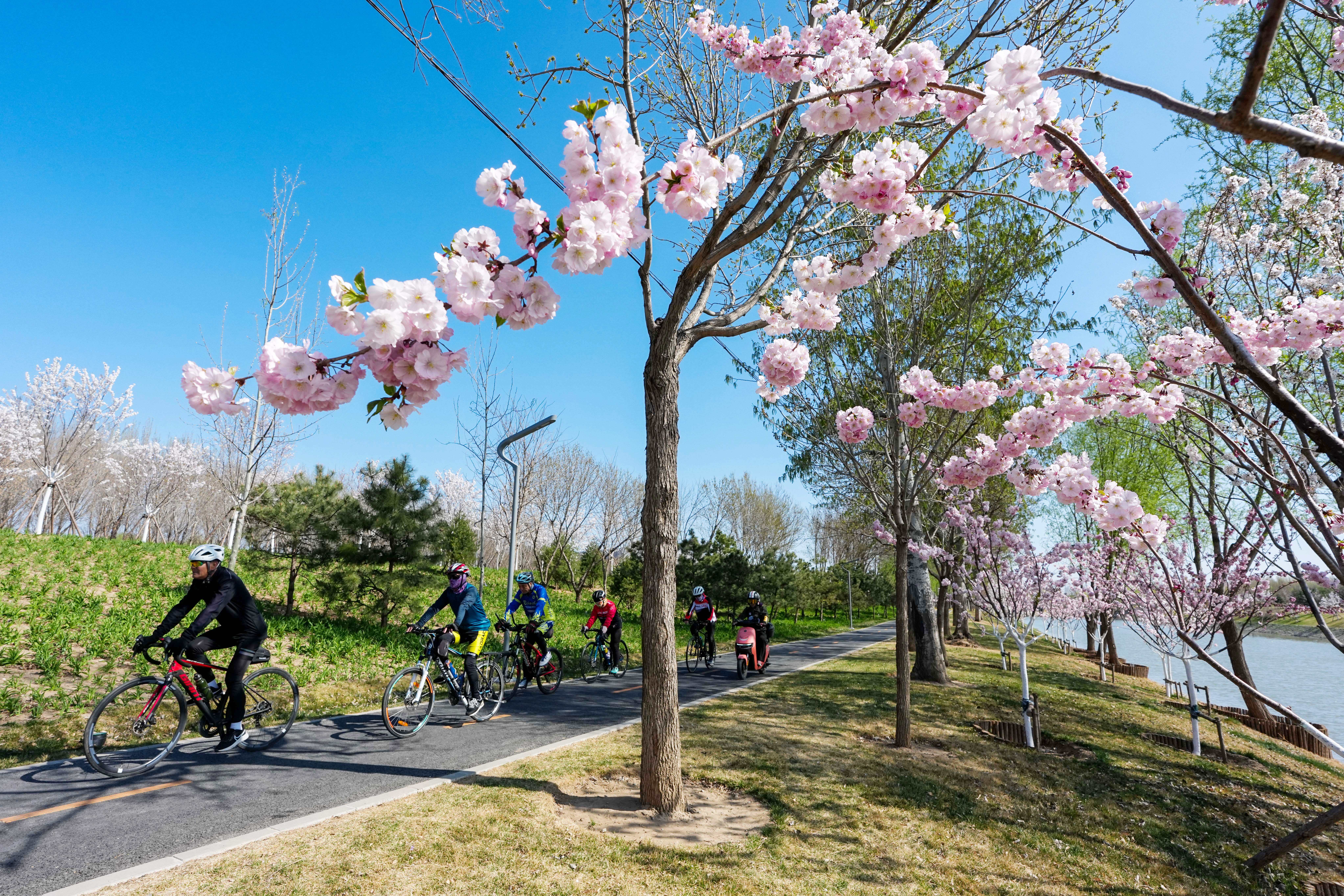 骑行爱好者在北京市坝河岸边骑车(4月1日摄)。 新华社记者 鞠焕宗 摄