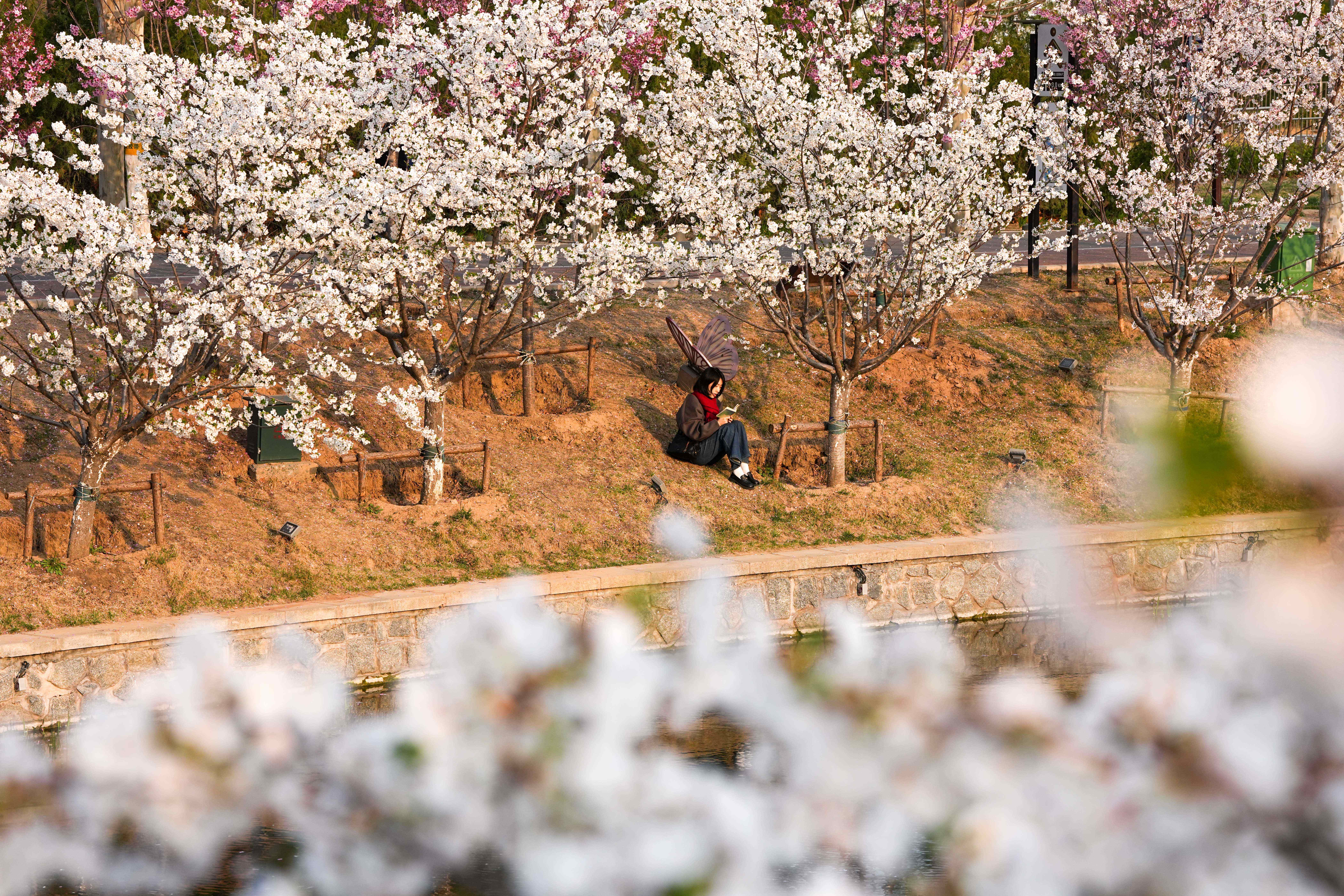 在北京朝阳区亮马河国际风情水岸,游客在岸边盛开的樱花下阅读(4月1日摄)。 新华社记者 鞠焕宗 摄