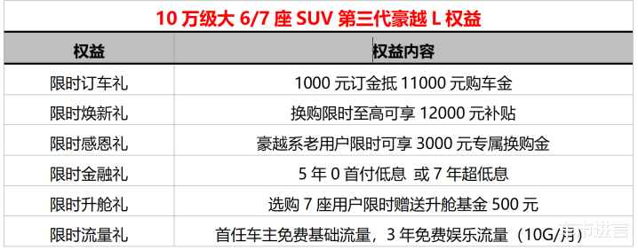 此次第三代豪越L重磅推出六项限时购车权益,在官方指导价基础上叠加限时交1000元抵110000元订车礼后,起售价仅为8.99万元,用一辆A级车的预算,就能开走一台可选5座6座7座的B级SUV。