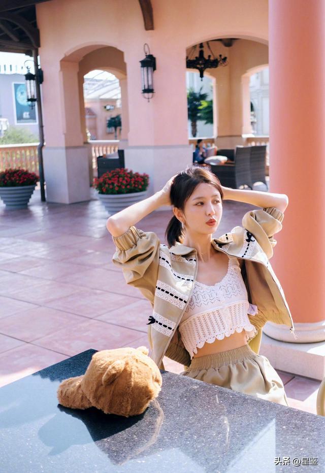 她选的这套卡其色休闲套装,真的是懒人穿搭的天花板。短款夹克+同色系花苞短裙,上宽下紧的版型刚好优化身材比例,把腰线露出来,瞬间拉长双腿,小个子也能穿出大长腿既视感。夹克上的蕾丝条纹和小蝴蝶结设计,又给休闲感加了几分精致,不会显得单调。内搭一件白色钩花镂空吊带,小露腰腹的设计,清爽又带点小性感,和外套的休闲感完美中和,甜而不腻。